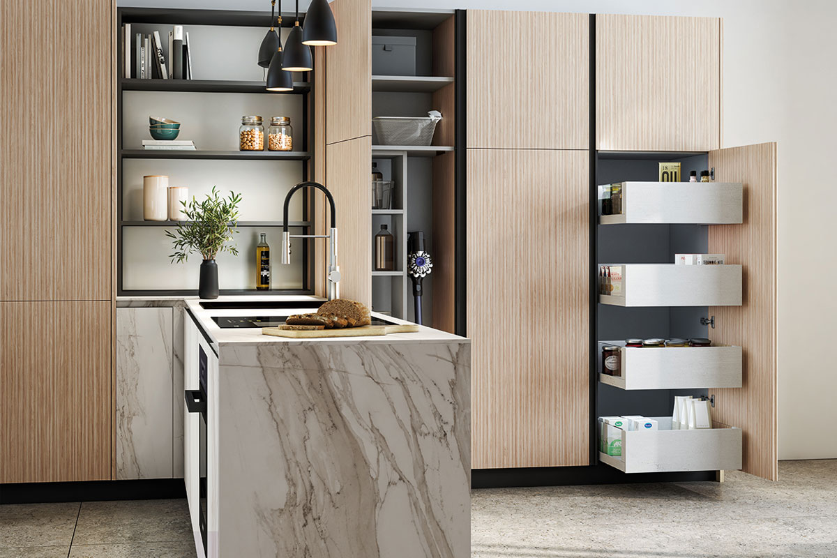 Menos muebles, pero más útiles. Cajones organizadores, despensas modulares y estanterías ocultas. Diseñamos cocinas con soluciones que aprovechan cada centímetro, manteniendo el orden y la estética.