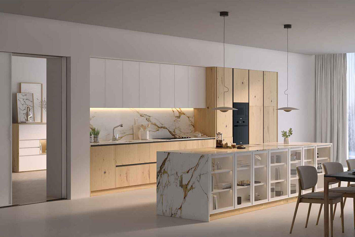 Las superficies cálidas, con texturas reales, vuelven con fuerza. En nuestras cocinas combinamos madera certificada con encimeras de cuarzo y mármol, logrando contrastes elegantes y contemporáneos.