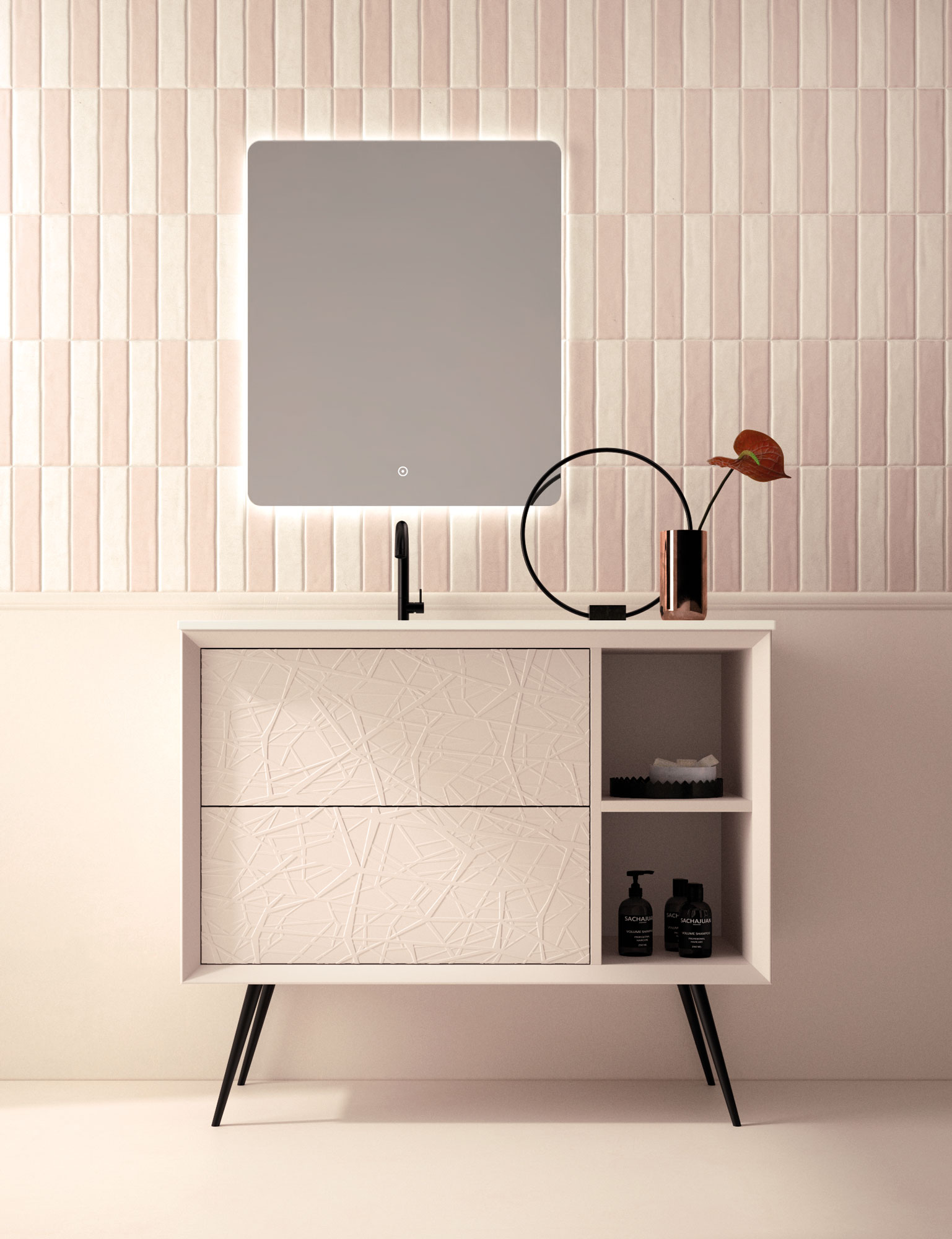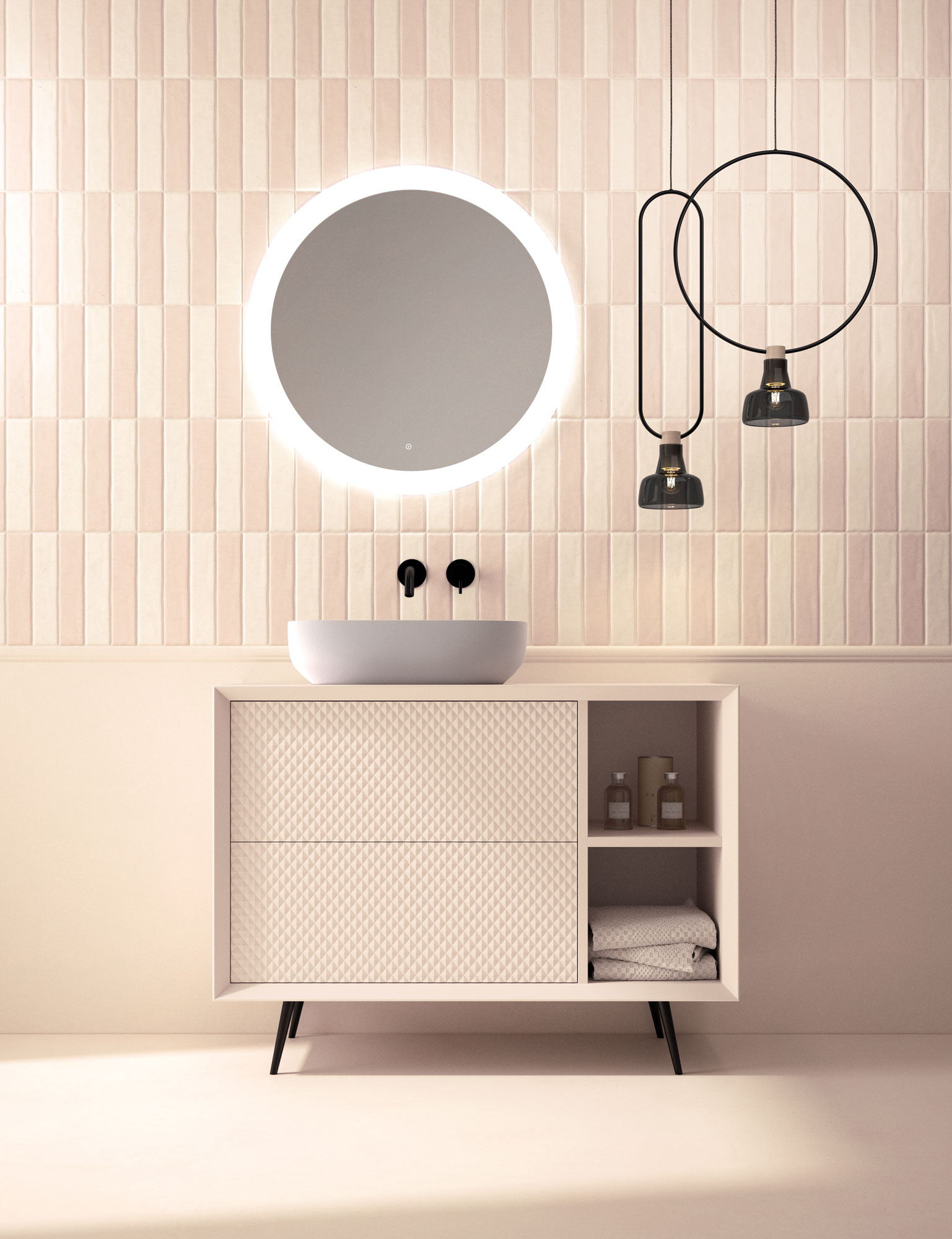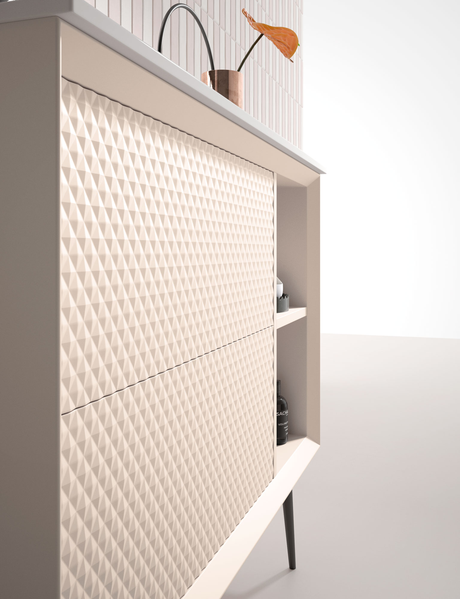 Una de las señas de identidad de esta colección son sus frentes con textura en relieve. Estos diseños 3D crean un juego de luces y sombras que añade profundidad y dinamismo al baño. Es una manera original de salir de lo convencional y darle a tu baño un aire sofisticado y moderno.